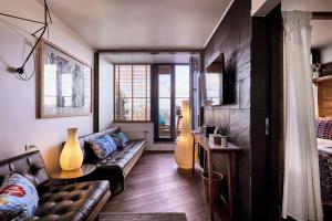 The hotel features 87 suites that include air conditioning, flat-screen TVs with cable channels, kitchenettes equipped with refrigerators and coffee machines, and seating areas. Some suites offer terraces with city or lake views. Bathrooms provide walk-in showers along with bathrobes, slippers, free toiletries, and hairdryers for guest convenience.