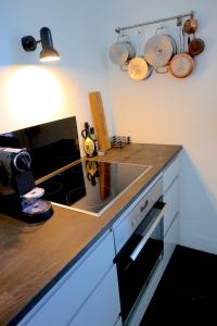 En el interior, el apartamento dispone de dos dormitorios y un baño equipado con ducha. La zona de estar incluye calefacción y cuenta con una chimenea para los días más fríos. Los huéspedes pueden disfrutar del entretenimiento en la televisión de pantalla plana con servicios de streaming o relajarse en el sofá del área común. La cocina completamente equipada contiene electrodomésticos esenciales como placa, frigorífico, lavavajillas, tostadora y utensilios para preparar las comidas.